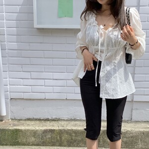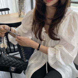 韩国ins早秋新品甜美百搭波点抽绳系带花边领设计感喇叭袖衬衫女