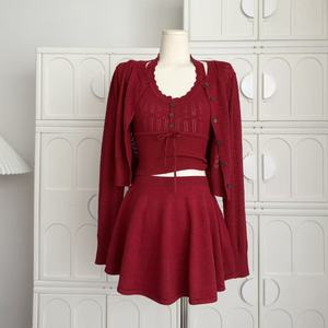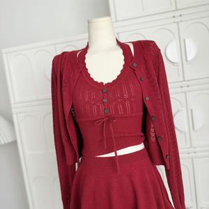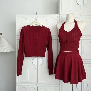 洛可甜妮 红色钩花羊毛针织开衫挂脖背心/半身裙套装