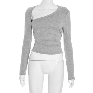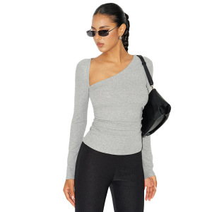 Y25TP350 欧美跨境女装秋季亚马逊新款纯色不规则领长袖T恤上衣女