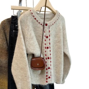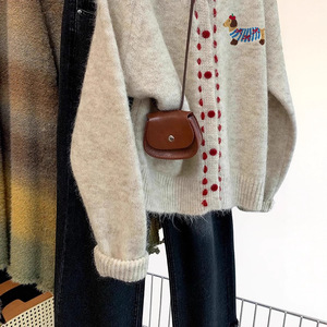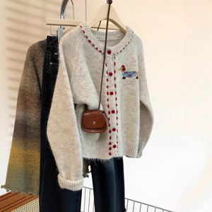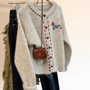 杏色小狗加厚圆领针织开衫女秋冬2025新款设计感外穿软糯毛衣外套