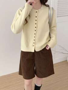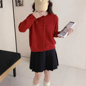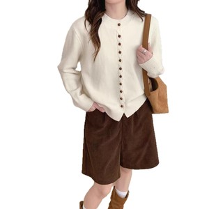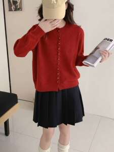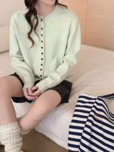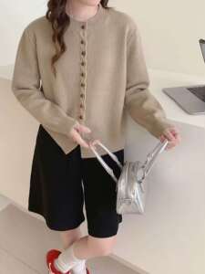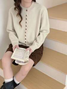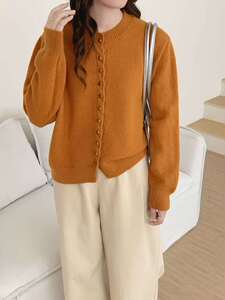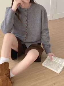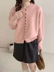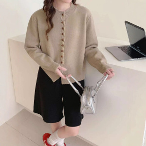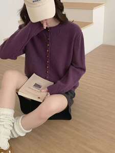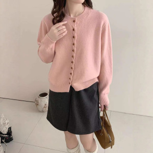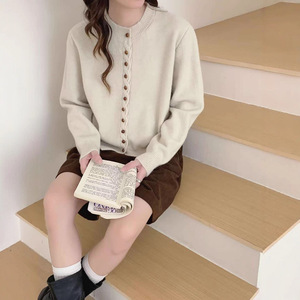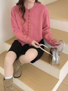 秋冬新款小香风圆领显瘦柔软长袖上衣休闲百搭宽松多扣针织上衣潮