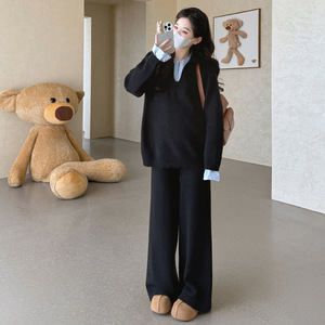 实拍现货2025孕妇秋冬衬衣拼接时尚毛衣休闲款时尚套装显瘦