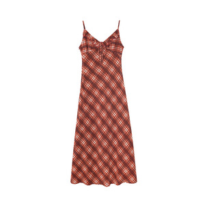 诠释美 NEWOPEN 25秋茶歇复古度假掐腰长裙格纹吊带连衣裙女F6228