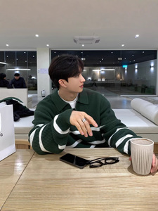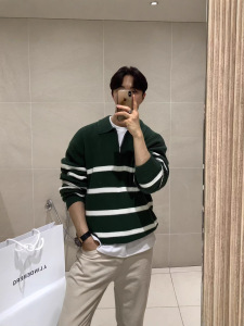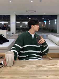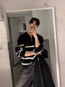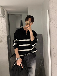 半高拉链领毛衣男秋冬季条纹针织打底衫港风潮牌休闲针织线衣上衣