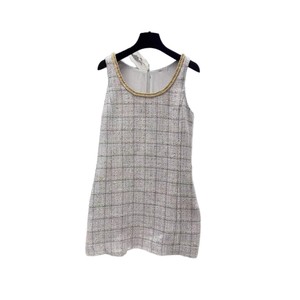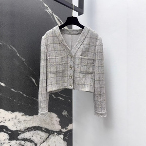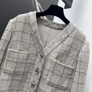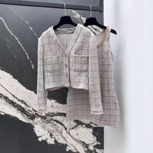 南油直供25早秋款时尚撞色格纹粗花呢修身外套经典V领外套+背心裙