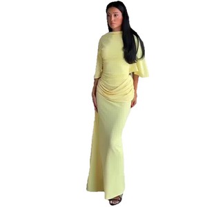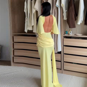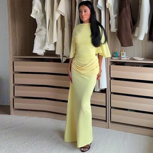 2025年夏新款欧美亚马逊跨境外贸女装不规则褶皱黄色收腰连衣长裙