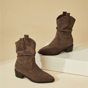 尖头复古短靴女夏季2025新款棕色美拉德靴子废土风绒面套筒西部靴