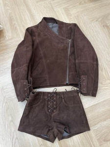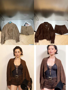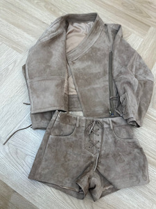 2025秋季新款進口真皮绒面小羊皮反绒皮衣外套短裤绑带设计套装女