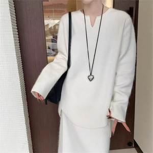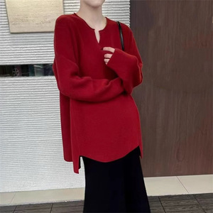 韩版套头剪刀领慵懒下摆不规则毛衣女2025新款宽松时尚针织衫上衣