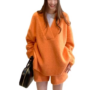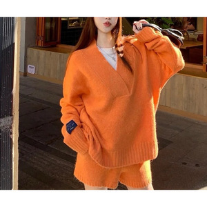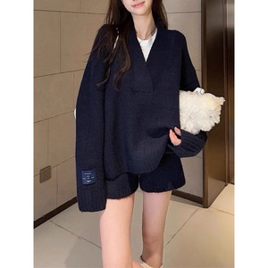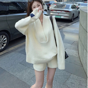 时尚套装女秋冬慵懒风松弛感宽松大v领针织衫毛衣+高腰短裤两件套