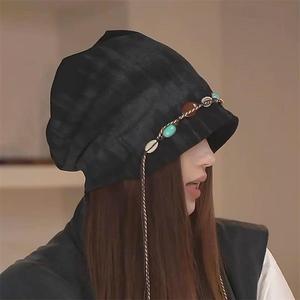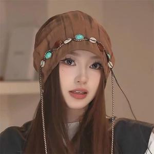 复古民族风堆堆帽子女薄款扎染流苏串珠蝴蝶装饰包头帽大头围冷帽