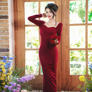 法式气质方领长袖连衣裙收腰设计感独特裙子秋季赫本风长裙高级感