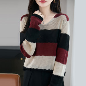 【厂家直供】春秋新款条纹V领拼色宽松针织衫时尚百搭打底毛衣女