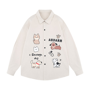 美式复古撞色趣味小狗印花长袖衬衫男女秋季宽松休闲个性情侣衬衣