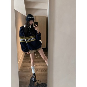 实拍 早秋新款韩系简约拼色条纹卫衣宽松版翻领休闲上衣女装88625