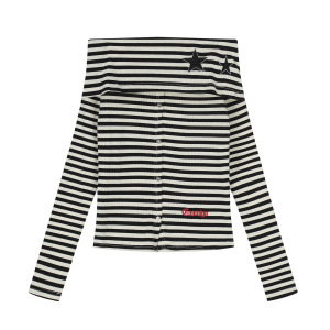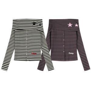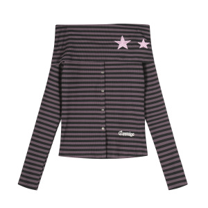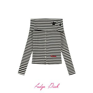 Fudge Pink 25秋季New美式复古辣妹个性设计条纹一字肩长袖T恤