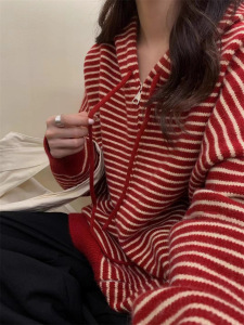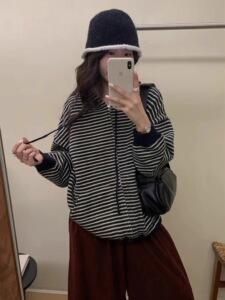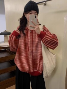 韩系复古条纹连帽宽松大版毛衣外套女秋冬新款长袖拉链针织开衫潮