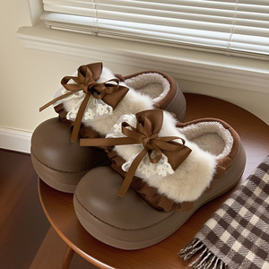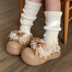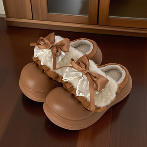 可爱外穿厚底甜美洛丽塔蝴蝶结毛毛拖鞋冬季女ins休闲保暖棉拖鞋