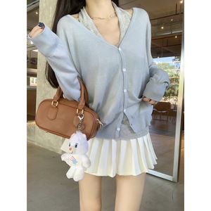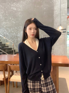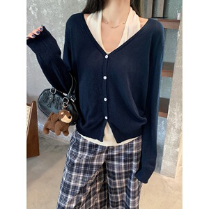 实拍 秋季韩版设计感假两件拼接挂脖针织衫毛衣V领长袖上衣88738