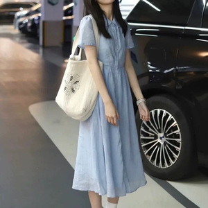 蓝色袖收法式连衣裙气质飞飞袖夏季高级新款今年流行爆款裙子中长