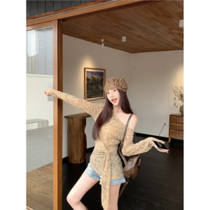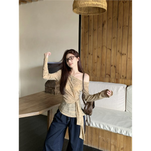 辣妹风复古扎染斜肩长袖T恤女秋季别致绑带收腰显瘦上衣