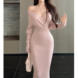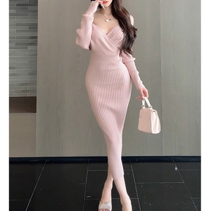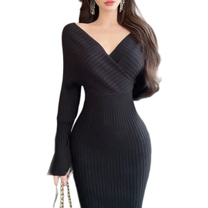 设计感V领针织连衣裙女2025秋冬新款包臀裙长裙收腰气质裙子女潮