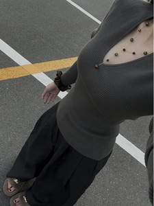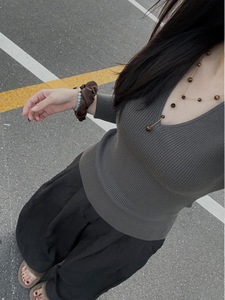 灰色短款低v领针织衫女秋季内搭紧身修身毛衣打底衫气质百搭上衣