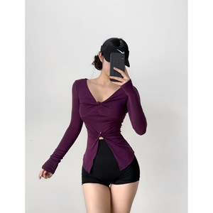 扭结法式不规则个性辣妹大领口显瘦瑜伽T恤运动服健身长袖女1860