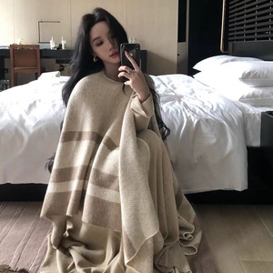 高级复古条纹仿羊绒披肩女秋冬保暖针织斗篷披风外搭围巾两用披肩