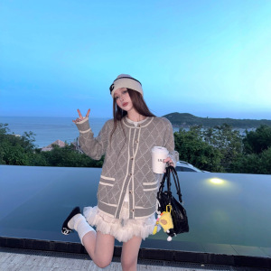 实拍 2025秋冬韩版设计感菱格毛衣外套女格雷风灰色针织开衫上衣