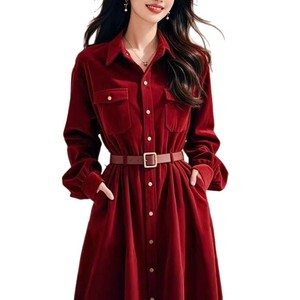 安可拉红灯芯绒衬衫连衣裙秋季气质收腰高端精致简单大方绝美长裙
