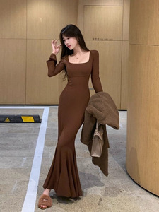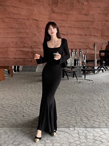 赫本风法式黑色气质长袖连衣裙女秋季高级感修身内搭包臀鱼尾长裙