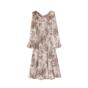 诠释美 NEWOPEN 25秋茶歇法式喇叭袖收腰荷叶边碎花连衣裙女F6577