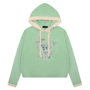 衣品男装韩系chic减龄卡通小狗印花绿色短款连帽毛衣女短款针织衫