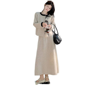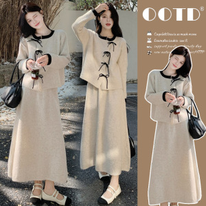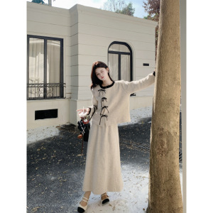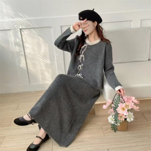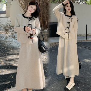 孕妇装2025秋冬季新款小香风系带长袖针织上衣半身裙孕妇两件套装