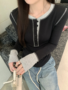 美式复古撞色针织T恤女冬季新款长袖内搭打底衫修身短款圆领上衣