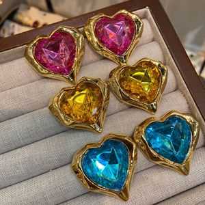 中古西洋粉黄蓝爱心宝石钻S925银针耳钉铜镀真金复古宫廷耳饰女
