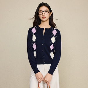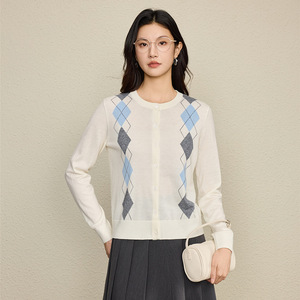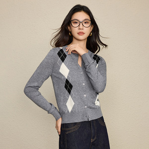 复古学院风菱格纹休闲撞色羊毛针织开衫女2025早秋穿搭圆领毛衣