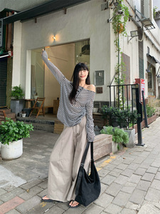 慵懒风撞色条纹露肩长袖T恤女秋季宽松百搭减龄别致休闲薄款上衣