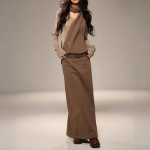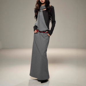 原创设计春秋废土风内搭假两件长袖挂脖收腰长款连衣裙女