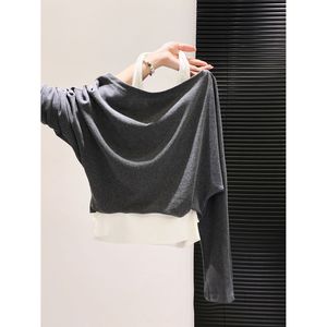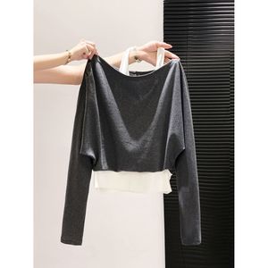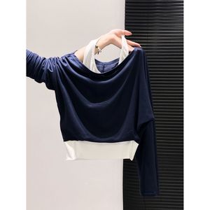 假两件挂脖一字领长袖t恤女早秋新款宽松显瘦外穿打底衫短款上衣