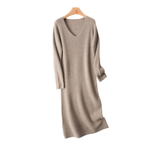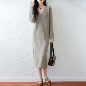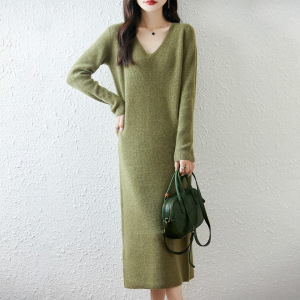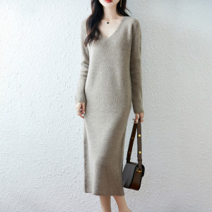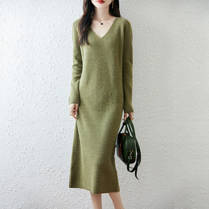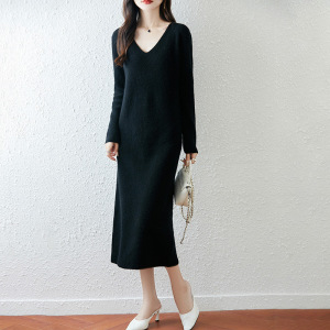 100羊毛连衣裙女秋冬内搭气质显瘦过膝V领毛衣裙简约一步打底裙