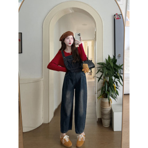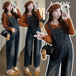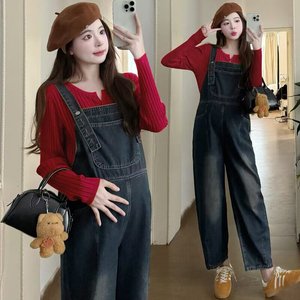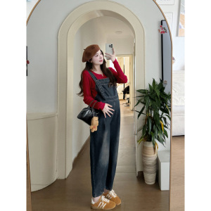 现货孕妇牛仔背带裤+针织开衫上衣孕妇背带裤套装