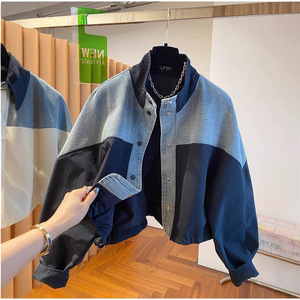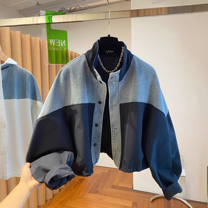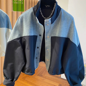 欧货牛仔拼接立领外套女2025秋季新款宽松休闲百搭短款夹克上衣