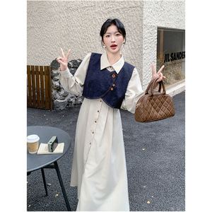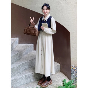 新款韩系连衣裙套装学院风减龄米杏色衬衫裙牛仔马甲两件套