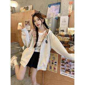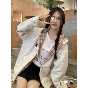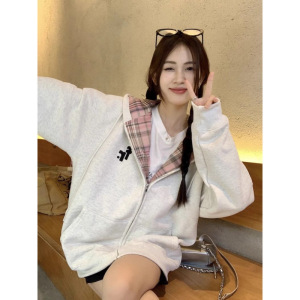 美式连帽卫衣女秋冬新款复古慵懒风洋气休闲格纹oversize长袖外套