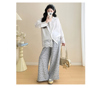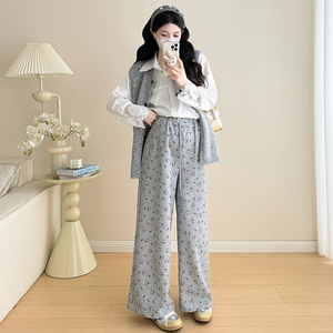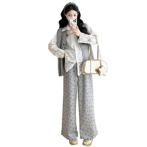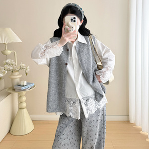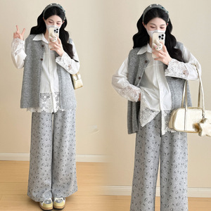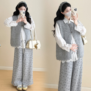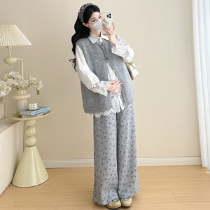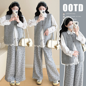 孕妇装秋套装高级感2025新款韩系针织马甲上衣衬衣阔腿裤子三件套