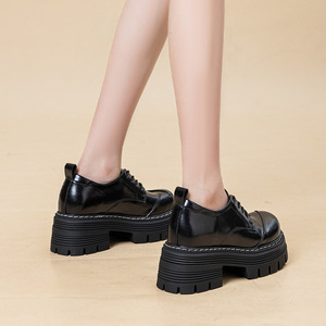 2025秋季新款厚底小皮鞋女黑色系带粗高跟英伦风小个子松糕小皮鞋