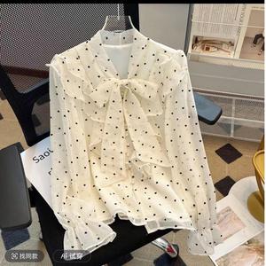 法式波点雪纺上衣女春蝴蝶结小衫气质名媛甜美荷叶边泡泡长袖衬衫