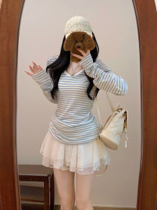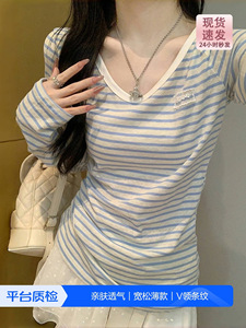 慵懒感miu系蓝色V领条纹防晒长袖T恤女秋季新款宽松薄款罩衫上衣